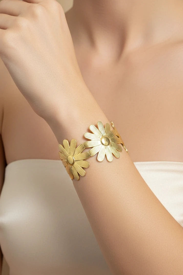 Add a touch of elegance to your look with this golden floral big cuff bracelet. Made from premium stainless steel, it features a bold flower-inspired design with a comfortable free-size fit, ideal for everyday wear or special occasions.