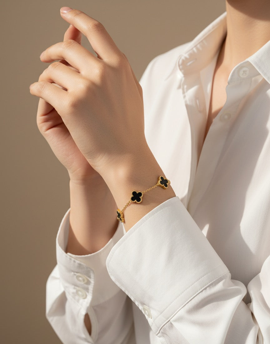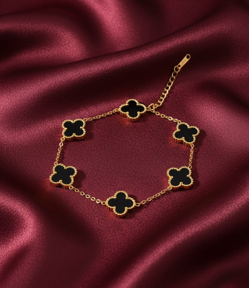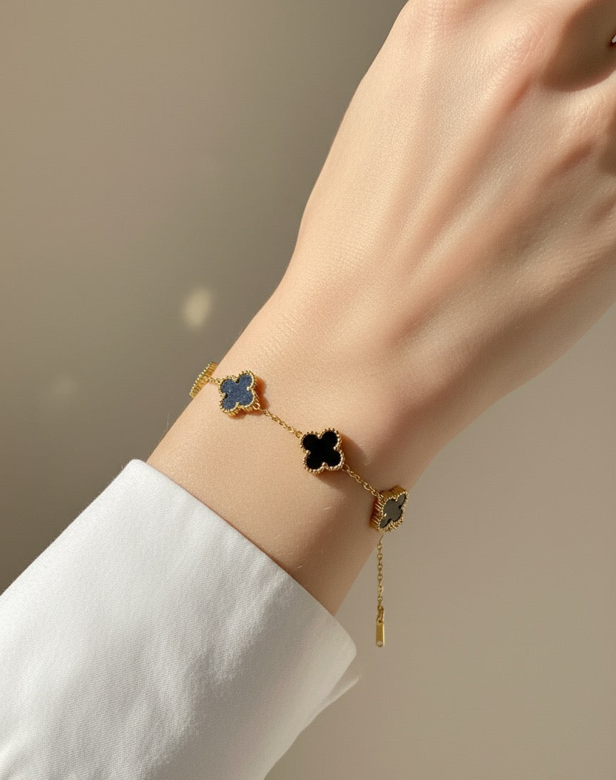 A delicate blend of black and golden tones, this bracelet features elegant clover-shaped accents that add a refined and modern charm. Crafted from stainless steel with an adjustable chain, it offers a lightweight yet luxurious feel perfect for everyday styling with a subtle statement touch.