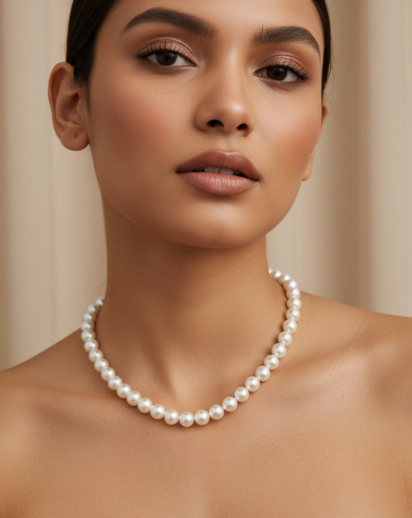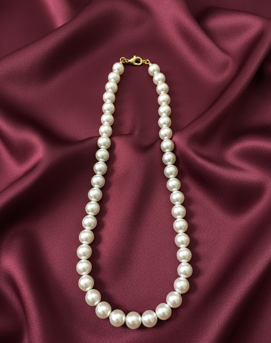 A classic strand of off-white premium pearls designed to bring effortless elegance and soft sophistication to any look. With its smooth finish and refined 17-inch silhouette, this necklace blends timeless charm with modern minimal styling perfect for both everyday grace and special occasions.