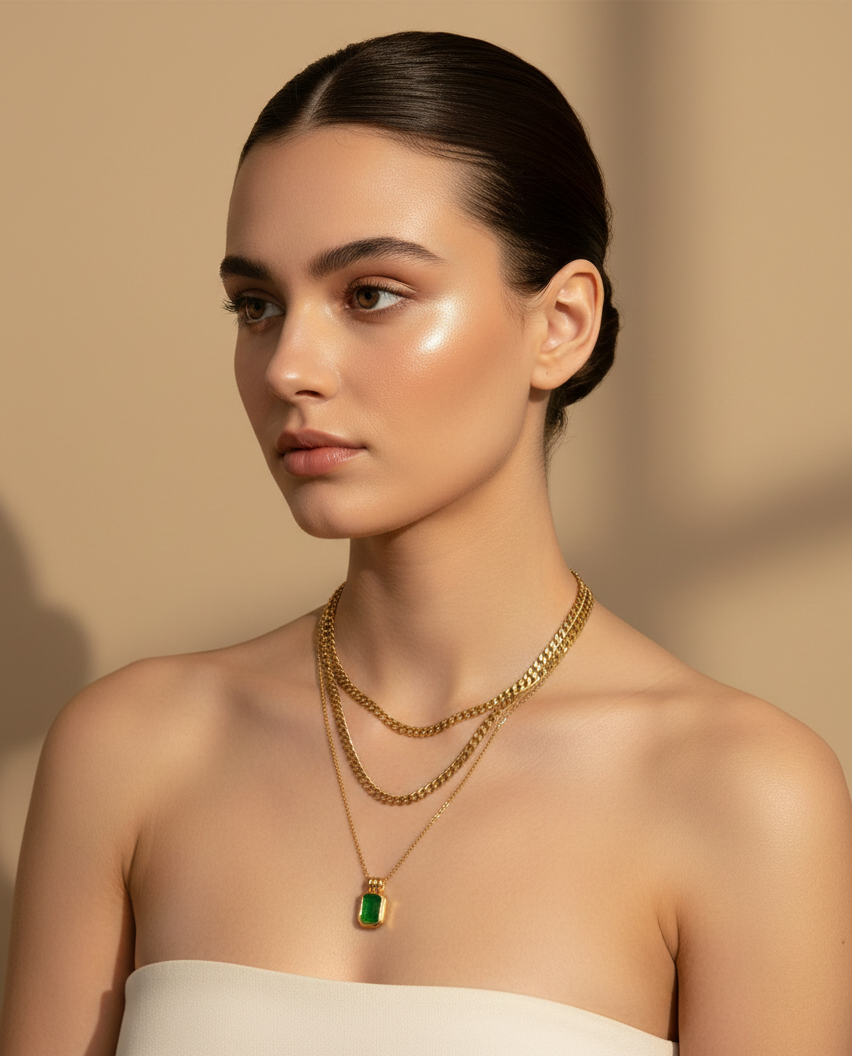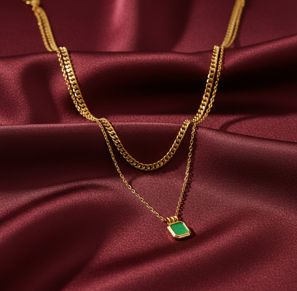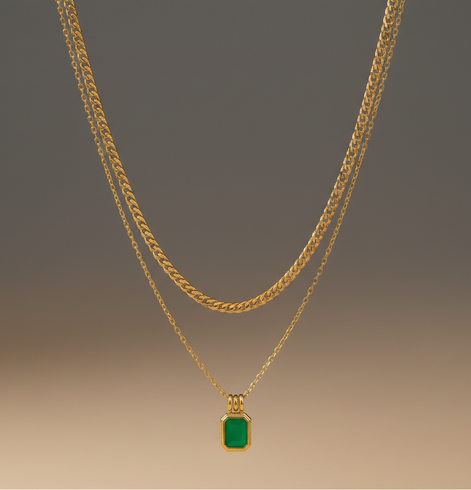 A graceful double-layered golden chain highlighted with a sleek green stone pendant. Crafted in stainless steel, it blends modern minimalism with a touch of rich colour for effortless day-to-evening styling.